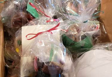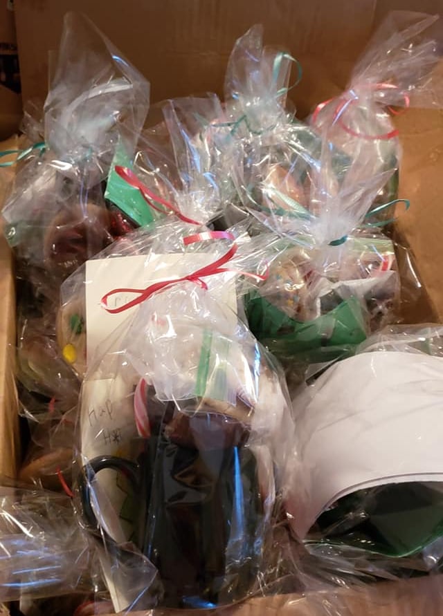 Each package has either a mug or ornament along with some gifts and a hand made card by children.